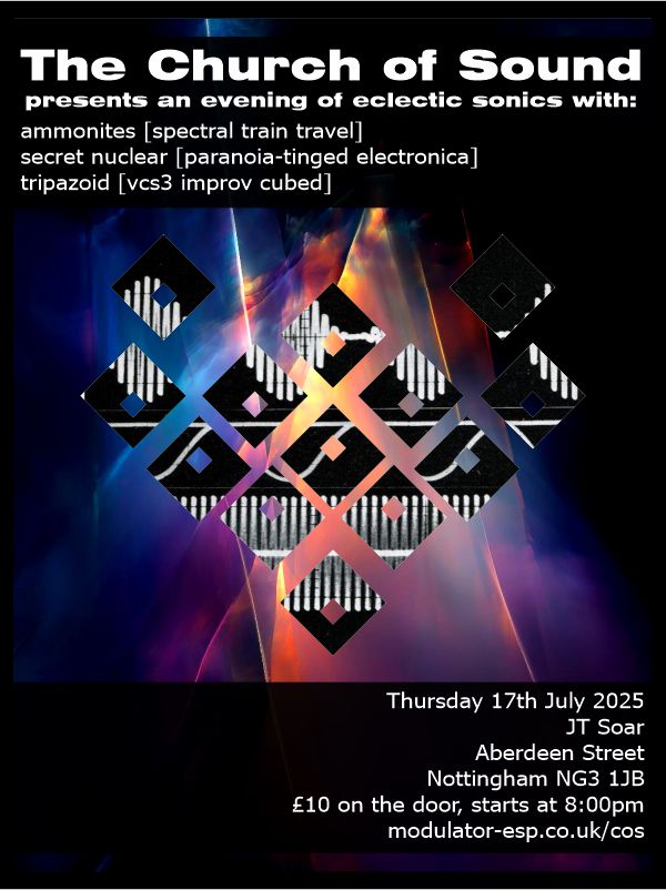 Tripazoid are Trapezoid extended to a trio, Stephen Howard (Mixup), Jez Creek and Stevo Petherick, they perform improvised electronic soundscapes using old EMS VCS3 synthesizers, they feel that their performances, which can be quite abstract and chaotic, are a collaboration between them and their synthesizers. It sometimes feels like a struggle, one that the synths often win!